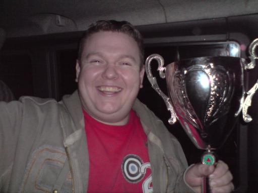 Paul 'Grahamo' Graham with the trophy on the Railway Club's bus. 'Do you think Basnett might actually part with a couple of quid and fill it up'