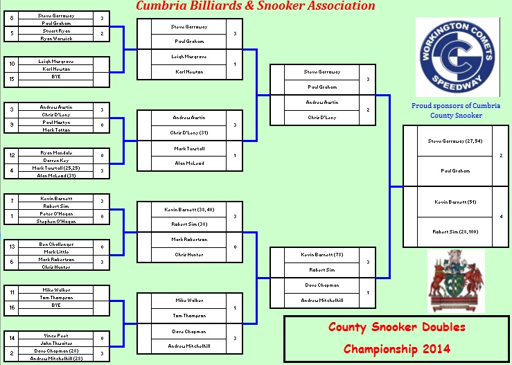The County Snooker Doubles Champions 2014 sponsored by Workington Comets are Robert Sim & Kevin Basnett after defeating last years’ runners up Steve Garroway & Paul Graham. The enthralling final was topped off with some excellent break building with Robert Sim’s century break being the icing on the cake to the delight of all lucky enough to see it develop.